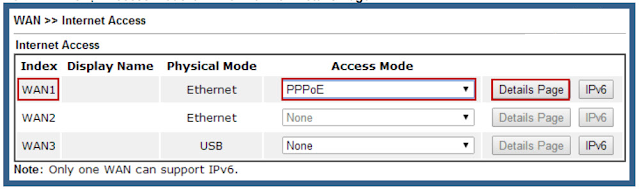- Ở WAN 1 : Chọn Access Mode là PPPoE và nhấn Details Page